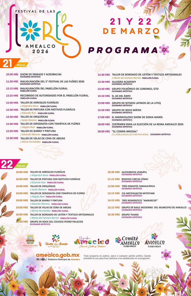 Durante estos dos días habrá talleres florales, exposiciones artesanales, música, danza, espectáculos artísticos y el certamen para la elección de la Reina Amealco 2026, en un ambiente lleno de cultura y tradición que celebra la belleza de nuestras flores y el talento de nuestra gente.