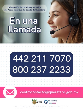 A través de las líneas 442 211 7070 y 800 237 2233 del Call Center del Poder Ejecutivo del Estado de Querétaro, la ciudadanía tiene acceso directo a información de 19 Secretarías, así como la vinculación necesaria sobre trámites municipales y federales con las dependencias correspondientes.