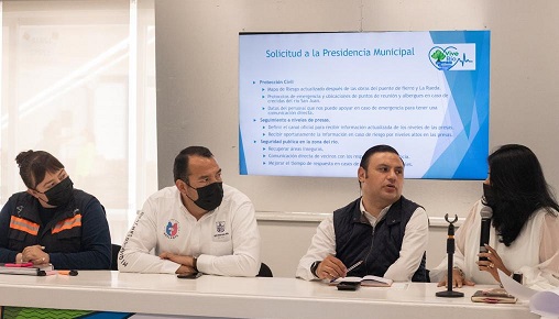 En la reunión que se llevó a cabo en las instalaciones de Centro Cívico, estuvieron presentes, el secretario de Desarrollo Sustentable, Oscar Alcántara Peña; la secretaria de Obras Públicas Municipales, Edith Álvarez Flores, el secretario de Gobierno, Diego Cabrera Leal; el secretario de Secretario de Seguridad Publica, Ángel Rangel Nieves; la coordinadora de Protección Civil, Verónica Laguna Luján y representantes de distintos fraccionamientos, colonias y comunidades cercanas al Río San Juan.