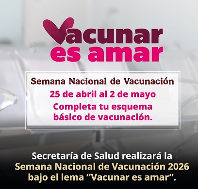 La Secretaría de Salud del Estado de Querétaro informa que en el marco de la vigésima cuarta Semana de Vacunación en las Américas (SVA) y Semana Mundial de Inmunización 2026, se llevará a cabo en el país la Semana Nacional de Vacunación 2026, bajo el lema “Vacunar es amar”, del 25 de abril al 2 de mayo de 2026 como parte de las acciones prioritarias para la prevención, control y eliminación de enfermedades.