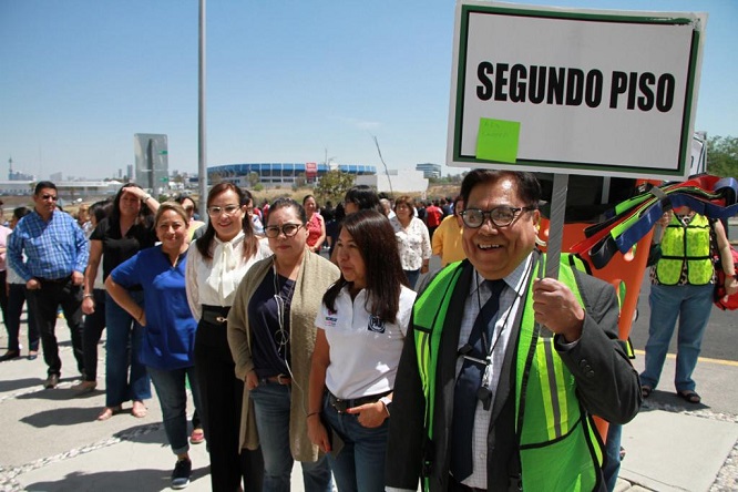En punto de las 11 de la mañana, se encendió el sistema de alarma del edificio, mismo que fue evacuado en su totalidad con el apoyo de los 32 brigadistas, en un tiempo de duración de 3 minutos 27 segundos.
